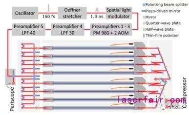 德国Jena课题组是该技术的开拓者。他们在2017年报道了利用集成化程度比较高的16个分离的光纤放大通道对光束进行放大再合束 [1],实验装置如图1所示。在主放大器之前,通过脉冲展宽器将脉冲展宽并用空间光调制器调节其相位,随后又经过3个PM980光纤、两个声光耦合器、2级模场直径分别为42 μm及56 μm的大轴距光纤进行了预放大,得到了50 w左右的功率。在该工作中,主放大器增益光纤为大模场面积棒状光纤。空间合成系统在分束时是用偏振分光器和半波片把光束先分为上下两束再进一步把上下的光束各分成并列的八束。为了提高合成效率和光束品质,该系统利用半波片及四分之一波片对非线性偏振旋转进行补偿;每个通道均有压电驱动的反射镜,用于稳定每路的相位。最终通过集成的布儒斯特型薄膜偏振器完成合束后,再利用Treacy型光栅压缩器对脉冲进行压缩。