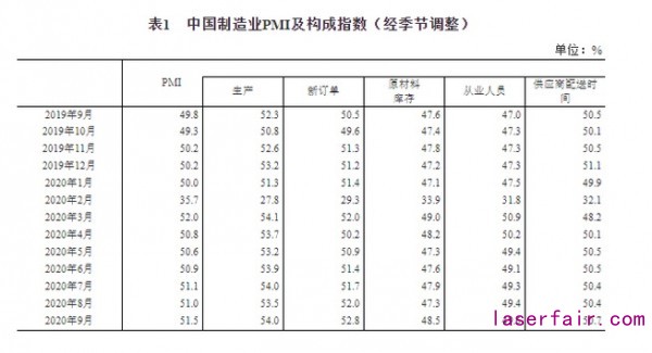 从企业规模看,大型企业PMI为52.5%,比上月上升0.5个百分点;中型企业PMI为50.7%,比上月回落0.9个百分点;小型企业PMI为50.1%,比上月上升2.4个百分点。从分类指数看,在构成制造业PMI的5个分类指数中,生产指数、新订单指数和供应商配送时间指数均高于临界点,原材料库存指数和从业人员指数均低于临界点。生产指数为54.0%,比上月上升0.5个百分点,表明制造业生产量环比继续增长。新订单指数为52.8%,比上月上升0.8个百分点,表明制造业市场需求持续回升。原材料库存指数为48.5%,比上月回升1.2个百分点,表明制造业主要原材料库存量降幅收窄。从业人员指数为49.6%,比上月回升0.2个百分点,表明制造业企业用工景气度有所改善。供应商配送时间指数为50.7%,比上月上升0.3个百分点,表明制造业原材料供应商交货时间继续加快。