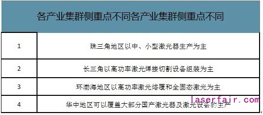 在产业集群方面,目前我国初步形成了珠三角、长三角、环渤海和华中四大激光产业集群,从地区来看,华中地区、华南地区和华北地区市场占比较高,三者之和为75%。同时激光设备行业庞大且应用广泛,基本形成了激光晶体、关键元器件、配套件、激光器、激光系统、应用开发、公共服务平台的产业链。