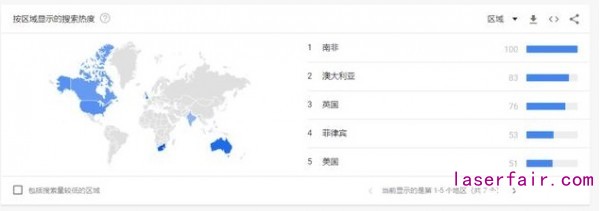 在国家分布上,近5年来,居于搜索热榜国家分别为南非、澳大利亚、英国、菲律宾及美国。