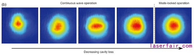 实验中脉冲由连续输出到锁模输出演化如图4所示,可见当被动锁模发生后,伴随着激光腔内形成飞秒脉冲,克尔诱导的自清洁效应极大地提高了光束质量。