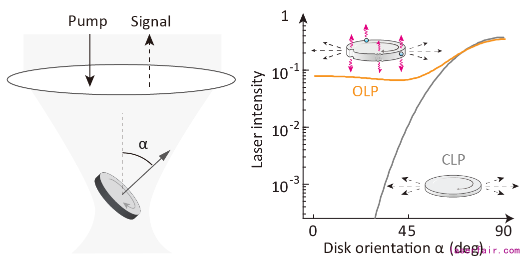 图2. 回音壁模式微盘腔的激光输出空间分布调控。激光颗粒泵浦激发和激光收集示意图(左)。传统微盘腔(CLP)以及全方位出射型微盘腔(OLP)的激光强度随微盘腔取向角的变化。全方位出射型激光颗粒是通过在微盘腔表面引入弹性散射(边缘缺陷或者纳米颗粒)实现。