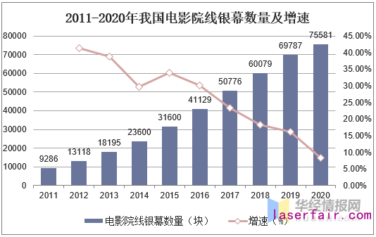 根据国家电影专资办发布的《2020年度中国电影市场数据报告》数据显示,2020年,中国电影总票房达到204.17亿元,因疫情影响比上年减少68.23%,但首次票房位居全球市场第一,其中2020年新增银幕5794块,全国银幕总数达到75581块。
