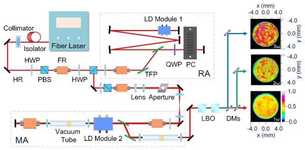该研究中,紫外激光器由前端可编程种子源、光隔离系统、再生放大器(RA)、光束整形器、主放大系统(MA)、谐波转换单元等部分组成。研究人员通过精确调控Nd:YAG激光器放大后基频激光脉冲的时间波形和空间分布,以提高其时空填充系数。120mJ、100Hz的1064nm激光脉冲通过两块LBO晶体进行三倍频后获得了脉冲能量为91mJ、脉宽470ps的355nm激光脉冲,三倍频转换效率高达76%,脉冲能量稳定性在3小时优于1.07%(RMS),实现了重频皮秒固态激光器中最高三倍频转换效率。