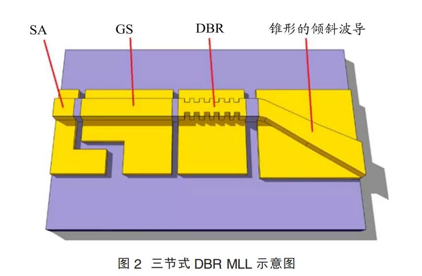 近年来,半导体锁模激光器在结构方面的研究也取得进展。2012 年,STRAIN M J 等人[13]提出了一种紧凑 的 半 导 体 锁 模 激 光 器(DBR MLL),其 几 何 结 构 如图 2 所示,该结构主要由 3 个部分组成:可饱和吸收器(SA)、增益(GS)和分布式布喇格反射器(DBR)。采 用 DBR 的频谱滤波在各种驱动条件下产生 Q 开关锁模,表现出了强大的无源开关锁模能力。锁模脉冲宽度约为 3.5 ps, 脉冲峰值功率与平均功率比高达 121, Q 开关在频率 1~4 GHz 连续可调。2014 年,中国科学院与英国邓迪大学[14]联合研制了针对 760 nm 波段的第一个半导体锁模超短脉冲激光器——基于 AlGaAs多量子阱结构的多节 LD 被动锁模, 该激光器产生波段大约为 766 nm 的脉冲,其脉冲持续时间大约低至4 ps,在激光腔长度为 1.8 nm、1.5 nm 时,其对应的脉冲重复率分别为 19.4 GHz、23.2 GHz。