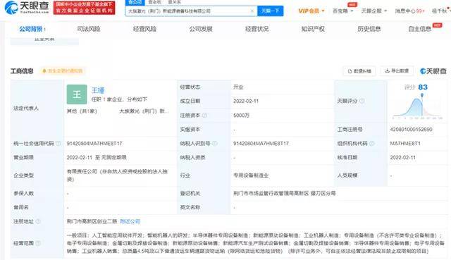 天眼查显示,2月11日大族激光(荆门)新能源装备科技有限公司成立,法定代表人为王瑾,注册资本5000万元。