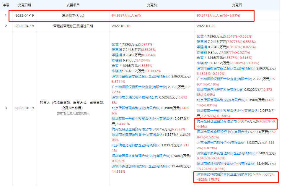 昨(19)日,微源光子(深圳)科技有限公司发生工商变更,新增华为关联公司 深圳哈勃科技投资合伙企业 (有限合伙) 为股东,同时公司注册资本由84.93万元人民币增加至90.82万元人民币,增幅6.93%。