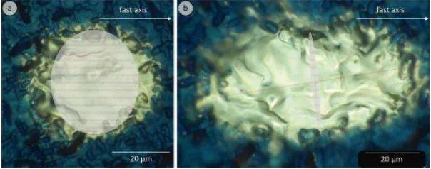 对于扫描速度为100m s–1、脉冲持续时间为数十纳秒的情况,可以忽略额外伸长(图3a;每侧减小约3μm)或标称交互作用区的减小。在这种情况下,产生的材料行为没有偏离静态激光束的单个脉冲行为。与此相反,在图3b(额外延伸30μm)中可以清楚地观察到,由于高偏转速度的影响,标称“脉冲”持续时间相互作用区(阴影区域)急剧减少。因此,在标称持续时间之外的区域,表演流畅性急剧下降。在这种情况下,必须预期材料性能的偏差。
