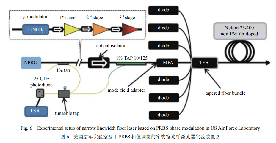2014 年,美国空军实验室的 Iyad Dajani 采用 25/400 光纤作为主放光纤,基于主振荡功率放大(MOPA)结构,搭建了四级放大的窄线宽光纤激光器,实验系统如图 6 所示。该激光器使用调制频率为 2 GHz 的 PRBS 信号作为相位调制源,通过优化实验参数来抑制 SBS 效应,最终获得了 1 kW 窄线宽激光输出,光束质量为 M2=1.1,光谱线宽为 2 GHz[25]。另外,使用调制频率为 3 GHz 的 PRBS 信号作为相位调制源,在光谱线宽为 3 GHz 时实现了 1.17 kW近衍射极限输出,功率的进一步提升主要受限于 SBS 效应[26]。