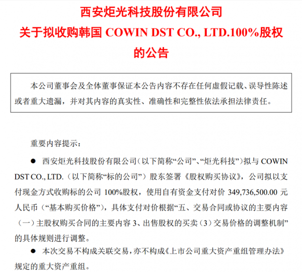 9月10日,炬光科技发布公告称,公司拟现金收购COWINDSTCO.,LTD.的100%股权,支付对价约3.5亿元。据了解,COWINDST公司是全球领先的显示面板修复设备、光罩(掩膜版)修...