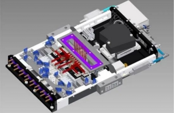2. 激光头均匀排布在龙门架上,如8个激光头,就将要刻划的模组分成8个区,每个激光工作模块负责一个区,填空般将八个区一一填满。玻璃基板每高速运动一次,划出8条线,但这8条电池线是孤立的,相互没有关联的。而在乐普科的设计理念中,12路光束整合在一个激光工作模块内,一次划出12条电池线,就直接构成了12个相邻的子电池,划线精度更可控,死区控制也更直接高效。