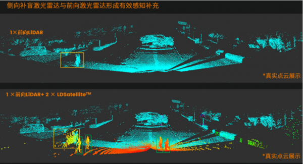LDSatellite™ 实现的补盲+前向组合探测使近场环境尽在掌握,解决了大部分激光雷达集中于前向长距检测垂直视场角不足、障碍物检测仍存在一定近场盲区、难以应对影响安全驾驶的近场复杂多变障碍物等问题。该产品的上车可有效补强前向主雷达的探测不足,例如在行人横穿马路时精准探知左右两侧靠近的行人,保障出行安全。