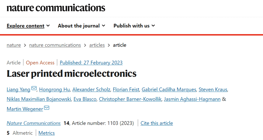 中国科学技术大学苏州高等研究院、卡尔斯鲁厄理工学院等研究人员对激光打印微电子元器件的研究以“Laser printed microelectronics”为题发表在《Nature Communications》上。