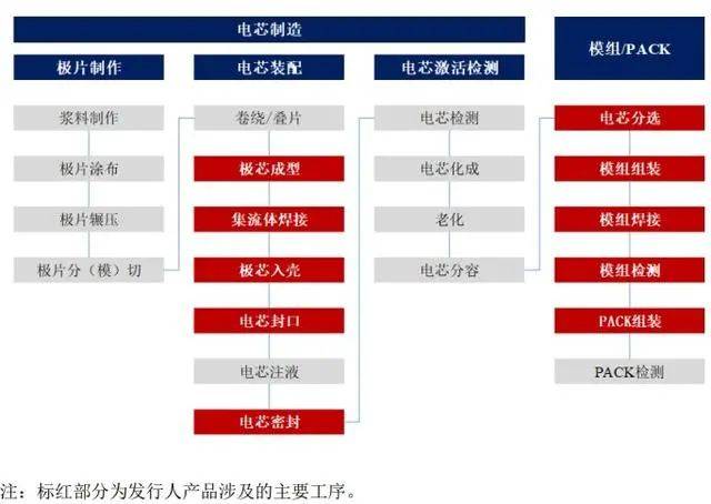 按照应用领域划分,公司主营产品可分为锂电池制造设备(以下简称“锂电设备”)及其他领域制造设备,其中锂电设备收入占比较高。锂电池的生产可分电芯制造和模组/PACK 两大环节,其中电芯制造包含极片制作(前段)、电芯装配(中段)和电芯激活检测(后段)三大工序。公司锂电设备产品主要用于电芯装配阶段和模组/PACK 阶段,具体情况如下: