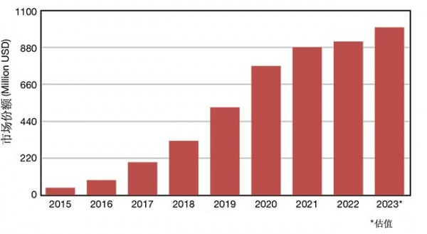 图8:2015-2023年间中国的超快激光器市场增长示意图。