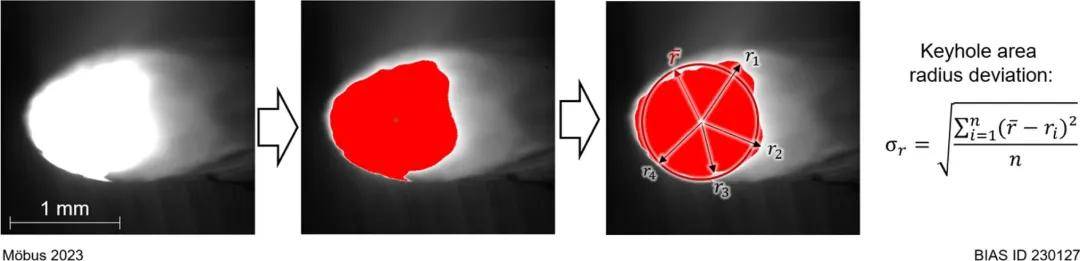图 5:左:用于测量锁孔面积的高速视频原始帧;左二:检测到的锁孔面积;右二:测量到的锁孔面积;右:锁孔面积半径偏差的定义