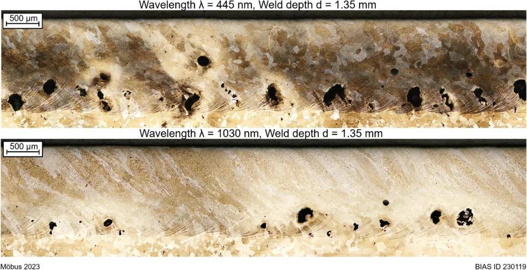 4.对于镍的激光束深熔焊接,与使用红外激光束波长的焊接工艺相比,使用菲涅尔吸收系数更高的蓝色波长可减少飞溅量并提高工艺稳定性。