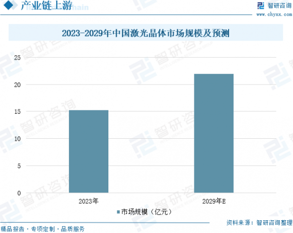 激光晶体是固体激光器的核心关键材料,在激光精密加工、激光武器、光电对抗、环境监测、激光医疗和超强超短激光大科学装置等军民领域有着重要和广泛的应用。激光晶体由基质晶体和激活离子构成,分别决定着其物化和光学特性,同时二者又相互影响。基质晶体主要是单一氧化物、氟化物、复合氧化物、复合氟化物,II-IV族化合物等,激活离子主要为稀土离子和过渡族离子等。相对于激光玻璃,激光晶体具有热导率高、光学各向异性等特点。目前激光晶体主要用于高峰值功率、大脉冲能量、高重复频率固体激光装置。数据显示,2023年中国激光晶体市场规模约为15.2亿元。随着我国经济稳定增长、科技水平不断提高、新兴产业发展迅速,市场对固体激光器产品的需求快速提升,将带动我国激光晶体市场持续扩大。预计2029年我国激光晶体行业规模将达到21.9亿元左右,继续保持较快的速度增长。
