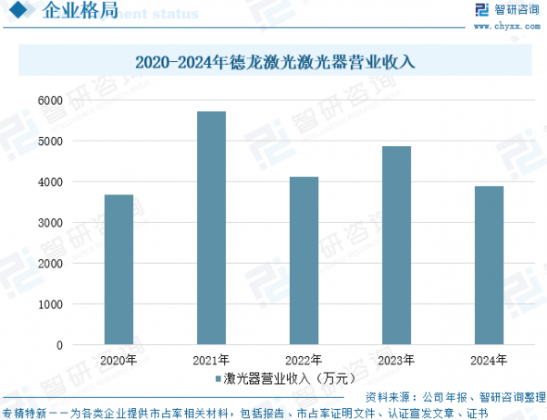 苏州德龙激光股份有限公司主营业务为高端工业应用精密激光加工设备及其核心器件激光器的研发、生产和销售。公司是一家技术驱动型企业,自成立以来,一直致力于新产品、新技术、新工艺的前沿研究和开发。公司专注于激光精细微加工领域,凭借先进的激光器技术、高精度运动控制技术以及深厚的激光精细微加工工艺积淀,聚焦于半导体、面板显示、新型电子及新能源等应用领域,为各种超薄、超硬、脆性、柔性及各种复合材料提供激光加工解决方案。同时,公司通过十多年自主研发,拥有激光器核心技术,产品线覆盖纳秒、超快(皮秒、飞秒)及可调脉宽系列固体激光器、光纤激光器、高功率半导体激光器等工业级量产成熟产品。据统计,2024年德龙激光激光器营业收入为3881万元,同比下降20%,主要是受激光器市场持续激烈的竞争影响,激光器销售不及预期。