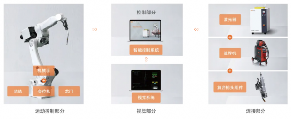 创鑫激光子公司宝辰鑫基于激光-电弧复合焊技术推出了船舶复合焊接子系统的标准化预集成方案,方案搭载高功率连续光纤激光器、定制化复合枪头组件及高度集成的智能控制系统;激光焊接头与电弧焊接头通过复合枪头结构,以双热源的方式搭载在机械手或其他运动控制平台上,并搭配视觉系统,实现高稳定、高质量的焊接,可应用于不锈钢、碳钢、铝合金等厚板材料的拼接焊或角焊等工艺。