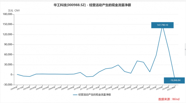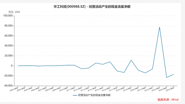 从Wind统计的历史数据来看,自2000年上市至今,华工科技前三季度的经营性现金净流量在2023年三季度创同期历史新高之后,旋即在2024年前三季度末暴跌至-2.35亿元,创A股上市25年来同期最低纪录,且2025年前三季度末该指标为-1.68亿元,依旧在同期第二低位徘徊。