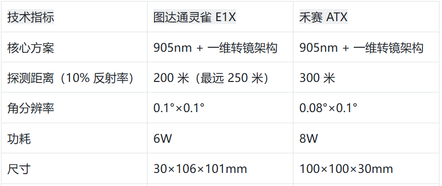 值得注意的是,灵雀E1X作为图达通首款905nm量产机型,其6W低功耗、3600元成本控制等优势,与其此前1550nm产品相比实现显著突破,而这些技术特性恰与禾赛AT系列的核心竞争力高度吻合。