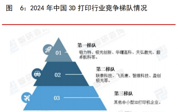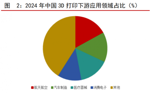 3D 打印产业链上游主要包括打印材料、核心零部件以及辅助运行系统,中游为打印材料制造商、打印设备厂商、打印服务提供商。下游涵盖领域不断扩展,2024 年全球 3D打印行业下游应用领域前三分别为汽车制造、消费电子、医疗器械,中国下游应用领域以工业级为主,前三分别为航天航空、汽车制造、医疗器械。