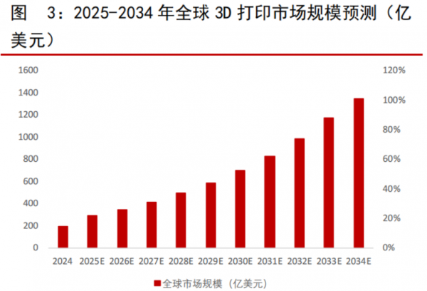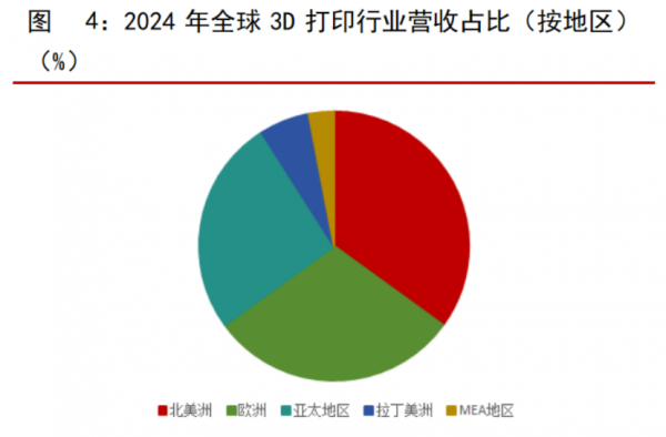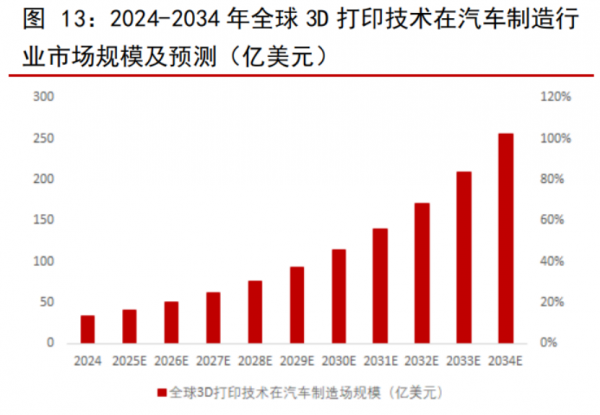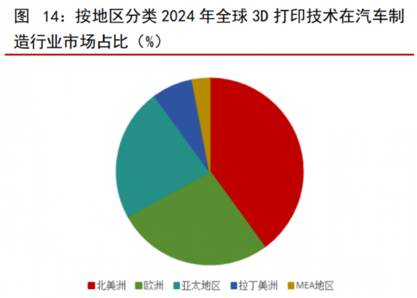 随着汽车制造领域的工装夹具、模具、新能源汽车轻量化等零部件的市场需求增加,将进一步助推3D 打印技术在汽车制造领域渗透率提升。根据 Precedence Research, 2024 年全球 3D 打印技术在汽车制造行业市场规模为 33.60 亿美元,预计 2025 年市场规模将超过 40.00 亿美元。在汽车制造领域,3D 打印技术渗透率最高的仍为北美地区,主要系 3D 打印技术能有效起到降本增效作用,福特、通用、特斯拉等美国汽车制造商均重度使用 3D 打印技术。此外,预计未来汽车制造行业的 3D 打印技术在亚太地区将快速发展。