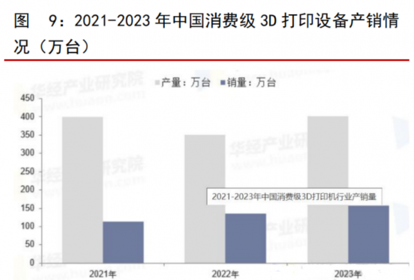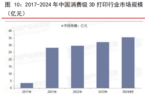 细分领域来看,国家政策支持及技术提升助推中国工业级3D 打印行业加快发展,行业市场规模上升空间巨大。根据共研产业咨询,预计 2027 年中国工业级3D 打印行业市场规模将突破 155.00 亿元,近五年呈逐渐增长趋势。随着技术和材料不断突破迭代, 3D 打印下游应用场景正由工业级渗透至消费级,逐步形成 B、C 端同步实现规模化、精细化、创新化的发展特点。消费级 3D 打印设备主要用于制作原型、模型和自定义物品,其操作简便、成本相对较低,一般采用 FDM、SLA 等技术。目前,消费级 3D 打印主要应用领域为消费品、学术/教育、文创等领域,占比分别为 43.00%、34.00%、10.00%。随着技术持续进步、成本下降,叠加个性化和文创产品需求增加等因素驱动,下游渗透率将加速提升,消费级 3D 打印设备销量将呈增长趋势,市场规模上限提升。