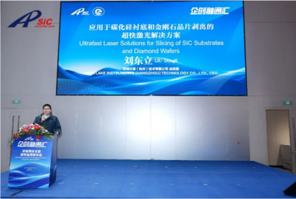 西湖仪器对产业前沿的洞察与实践,不仅体现在产品与参编工作中,更已形成系统化的解决方案。在11月25-27日于河南郑州举办的第六届亚太碳化硅及相关材料国际会议(APCSCRM 2025)期间,西湖仪器自主研发的“应用于碳化硅衬底和金刚石晶片剥离的超快激光解决方案”,因其创新的技术路径与明确的产业化价值,成功入选中国科协企业创新服务中心2025企创融通汇“芯机遇促发展 解锁应用新市场”专题优秀解决方案,获得了来自产学研各界的关注。会议同期,西湖仪器总经理刘东立博士受邀在“金刚石专题论坛”上,分享了《应用于碳化硅衬底和金刚石晶片剥离的超快激光解决方案》主题报告。刘博士向业界深入介绍了该方案在碳化硅衬底与金刚石晶片加工中的创新应用,系统分享了公司在材料制备、精密加工、装备创新等环节的技术突破与产业化实践经验。