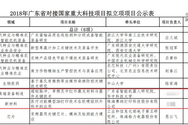 2018年广东省对接国家重大科技项目,激光和3D打印项目各获得1000万资金