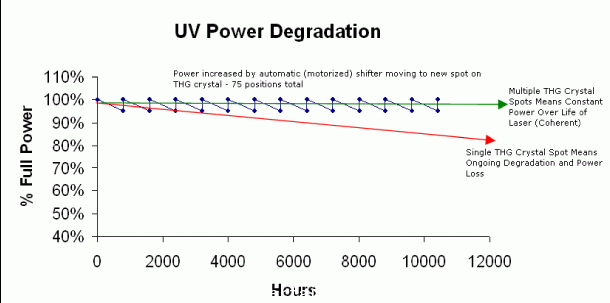 功率随时间变化保持恒定– 随着工作时间推移,三倍频(倍频)晶体逐渐在出光过程中退化,最后导致紫外光功率下降。AVIA使用一块大体积多点位置设计的三倍频晶体和晶体换位器来解决这个问题,通过自动移动THG晶体,输出功率恢复到出厂水平。所有的AVIA激光器都提供一个至少75个点位THG晶体,与其它同类的只具有一个点位的产品相比优势不言而喻。如下图所示,紫外线功率恢复到最初出厂时的指标。