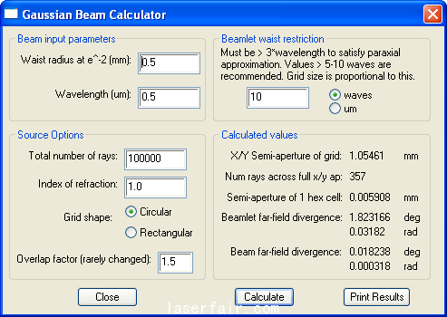在FRED里用高斯光束集(beamlets)表述相干光源,光源的光束网格空间用于确定光束集的束腰和发散角。为了恰当地对相干光束传播特性进行建模,光束集必须保持高斯型分布。结果,一些高斯光束要计算近似的网格尺寸以及相干光源的光线数。附件中的脚本程序利用欲得的光源参数计算并显示新的相干光源的输入。该计算器适于如下光源类型:
