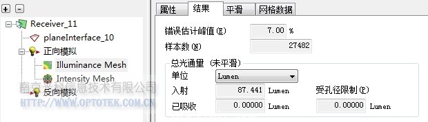 照度网格结果,其中我们关注的是入射到此接收器上的光通量为87.441 lm。