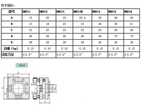 OM210系列反射/分光镜架(压圈+拉簧) 产品类型:OM210系列反射/分光镜架(压圈+拉簧) 产品描述: 主要特征: ●两维倾斜调整; ●M60.25细牙螺杆调节; ●拉簧复位...