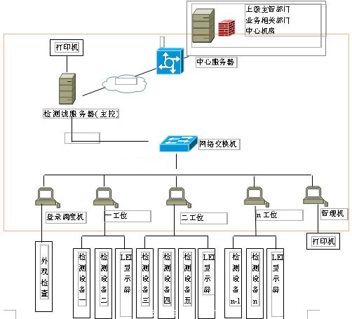 计算机联网检测系统以检测线服务器为中心构成检测站局域网实现线内资源共享,同时与上级主管部门及相关业务部门连成广域网,以实现信息的共享与职能的监管。目前常用的网络结构为星型拓朴结构,网络操作系统多采用Windows 2000 Server,而数据库平台则常见Oracle、 Microsoft SQL Server2000等大型关系数据库。
