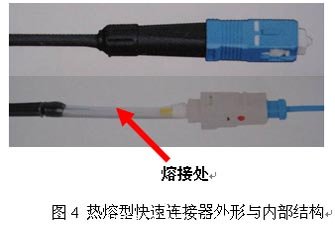 热熔型快速连接器,如下图4,实际上一样是光纤熔接,只不过熔接点在连接器尾端内部,相当于热熔把尾纤的尾缆给省掉了,这样做的好处是熔接好后,不需作额外保护。