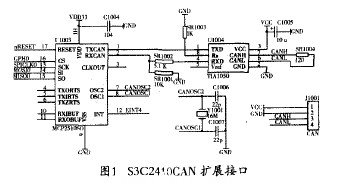 由于S3C2410和S3C44B0不带CAN接口,所以必须对其进行扩展。S3C2410的CAN 扩展接El如图1所示,S3CA4B0的CAN接口与其相似。