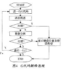 G代码解释的原理如同4所示。程序中定义了两个数据结构PreGCode和GCode分别用来保存语法检查后的中间结果和数据分析后生成的G代码类型、节点坐标、圆弧半径等数据,供仿真和加工使用。
