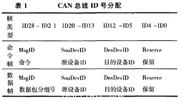 本系统使用CAN控制器MCP2510完成CAN总线帧的发送和接收任务。通信数据分为命令帧和数据帧两种。通信协议利用了CAN总线的29位扩展标识符保存了一些协议中必要的信息,如表1所示。由于CAN支持多主机和多从机模式,所以为源设备和目的设备地址分配了ID,以区分数据的来源和目的地。数据帧的数据量较大,必须分批传送,所以标识符里还包含了数据包分组号,用来排序。