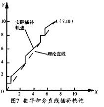 数字积分法插补器的关键部件是累加器和被积函数寄存器,每一个坐标方向就需要一个累加器和一个被积函数寄存器。一般情况下,插补开始前,累加器清零,被积函数寄存器分别寄存X和Y ;插补开始后,每来一个累加脉冲△£,被积函数寄存器里的内容在相应的累加器中相加一次,相加后的溢出作为驱动相应坐标轴的进给脉冲Ax(或Ay),而余数仍寄存在累加器中;当脉冲源发出的累加脉冲数m恰好等于被积函数寄存器的容量2 时,溢出的脉冲数等于以脉冲当量为最小单位的终点坐标,刀具运行到终点。数字积分法插补第1象限直线的程序流程图如图6所示,插补轨迹如图7所示。