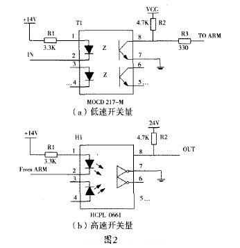 在低速开关量中,由图2(a)可以看出,这里采用贴片低速光耦MOCD217一M。它是Motorola公司的产品,是具有低输入电流的双路光耦。之所以这里在接人输入口之前加入电阻R3,是因为ARM 中的部分I/0 口是开漏式的,防止在输入输出过程中电流过大,将相应口烧坏。如图2(b)在高速开关量中,采用HC—PL0661双路光耦进行扩展,它是Agilent Technologies公司的产品,其开关速率可达到1O M左右,可应用于各种高速脉冲输入输出的场合。