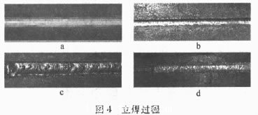 a. 在早期试验中,电流、电压值与焊速的匹配总不令人满意。采用的MIG脉冲焊,其宜于用较小的平均电流进行焊接,特点是熔池体积小,不易淌流,且在脉冲峰值电流作用下,熔滴的轴向性好,故比起普通氩弧焊更有利于焊缝成形,在全位置焊中有很好的效果。试验中早期打底焊焊速一般在8cm/min以上,相应电流值也较高,在95-105A之间,焊接过程不太稳定,背面成形有时也不理想。究其原因,在于脉冲幅值的影响,脉冲电流使熔滴呈喷射过渡,在较大脉冲电流下较小的电压易造成大飞溅、淌流,而大电压表面成形也不理想。我们在试验中不断摸索,后在稳定幅值的前提下适当减小电流、电压并且降低焊速,这样在横向和垂直位置的焊接过程中,充分发挥出了脉冲焊工艺在全位置焊上的优点,焊接过程稳定,飞溅小,两面成形都很理想。图4a、图4b、图4c、图4d 依次为立焊焊前加衬垫样板、立焊背面成形、打底和盖面成形样例。