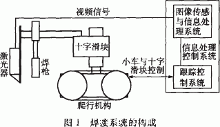 爬行式弧焊机器人系统的构成主要由永磁履带爬行机构、激光图像传感系统、信息处理及跟踪控制系统所组成,如图1 所示。爬行机构是机器人的运动动力系统;图像传感与信息处理系统构成焊接识别系统,以识别焊缝,与跟踪控制系统一起组成焊缝跟踪系统,以实现运动中的焊缝跟踪和焊接。