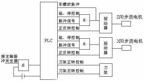 普通车床数控化改造工作就是将刀架、X、Z向进给改为数控控制。根据改造特点,伺服元件采用步进电机,实行开环控制系统就能满足要求。Z向脉冲当量取0.01mm,X向脉冲当量取0.005mm。选用晶体管输出型的PLC。驱动步进电机脉冲信号由编程产生,通过程序产生不同频率脉冲实现变速。X、Z向动作可通过输入手动操作或程序自动控制。车螺纹的脉冲信号由主轴脉冲发生器产生,通过与门电路接入PLC输入端,经PLC程序变频得到所需导程的脉冲。刀架转位、车刀进、退可由手动或自动程序控制。图1为数控系统原理图。[1]
