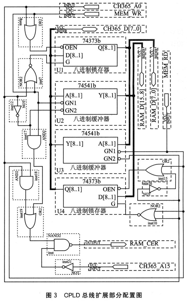 CPLD芯片选用A1tera公司生产的EPM7064,通过CH365地址线A0的使能对16位数据进行分时读/写,从而解决了数据总线的扩展问题。其内部逻辑电路如图3所示,其中主要包括2个锁存器(74373b),和2个三态门缓冲器(74541b)。