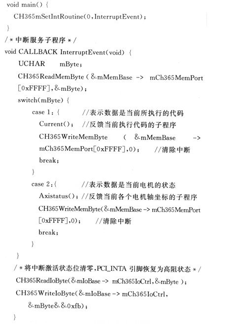 数据反馈功能主要是通过CH365响应DSP中断来实现的。DSP程序将数据写入双口RAM低4 KB空间后向CH365申请中断,CH365响应中断将数据反馈到PC并显示到人机界面。中断函数部分代码如下: