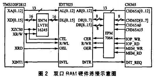 系统采用了双口RAM作为DSP和CH365之间数据传输的缓冲芯片,而TMS320F2812的地址总线为19位,IDT7025为13位,CH365为16位,因此,把IDT7025的13位地址线A[O..12]分别与DSP的地址线XA[O..12]和CH365的地址线A[O..12]相连,并将CH365的地址线A0用作数据总线扩展的使能信号。