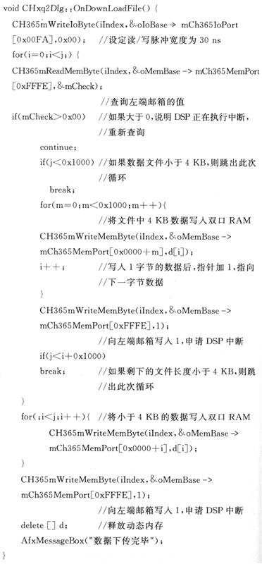 由上述可知,双口RAM的高4 KB空间用于PC机向DSP下载数据,如果数据大于4 KB,则存在着一次不能够把全部数据下载到DSP中的问题。因此,采取了向双口RAM中循环写入数据的办法,即PC机向双口RAM一次只写入4 KB数据,接着向DSP申请中断。DSP响应中断一次性将4 KB数据复制到DSP其他大容量存储空间(如扩展SRAM)中,然后释放双口RAM空间。此时PC机便可再写入4 KB数据,如此循环往复,直到将所有数据都写入DSP中。部分代码如下: