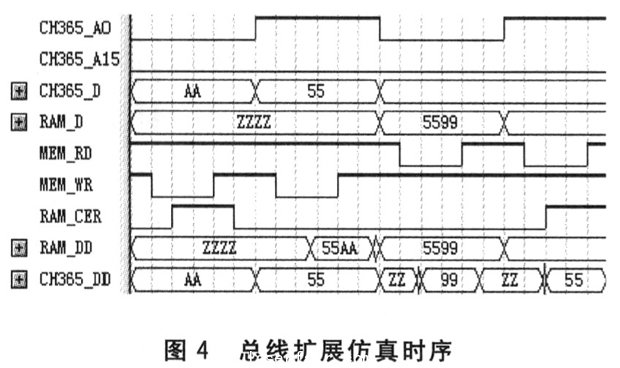 对上述逻辑关系用“MAX+PLUS”进行仿真后,得到图4所示的时序。图中RAM_DD和CH365_DD表示仿真结果,从图中可知仿真结果完全符合设计要求。